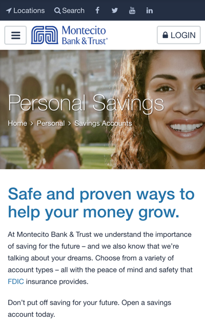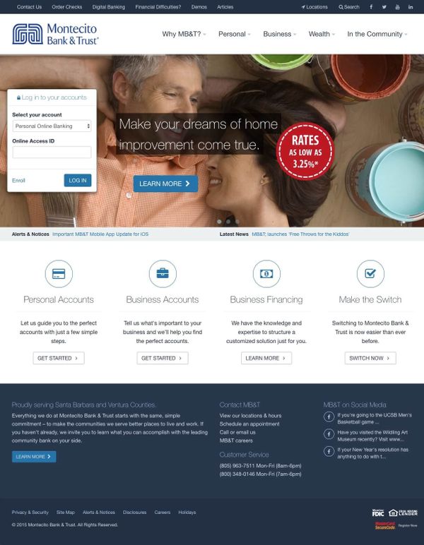 Montecito Bank & Trust, the largest locally owned community bank located on the Central Coast, needed a complete website refresh in order to modernize and take advantage of emerging technologies such as responsive web design. From initial concepts to a fully-functioning product, I provided MB&T with an all-new responsive design and completely rewrote the underlying code, reducing load times, increasing mobile and tablet functionality. Additionally, custom tools were built allowing employees to maintain and build website pages, track customer statistics, and administer various marketing programs.